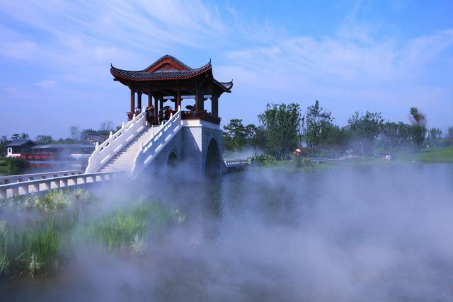 在亭臺樓閣休閑一角也能體會到霧森系統(tǒng)的魅力!霧從橋下升騰而出,朦朦薄霧,宛若仙女身上的紗帶,在裊裊飄動。輕輕抓一把,軟綿綿的白霧頃刻間消失不見,留在手中的只剩下冰冰涼涼的觸感。